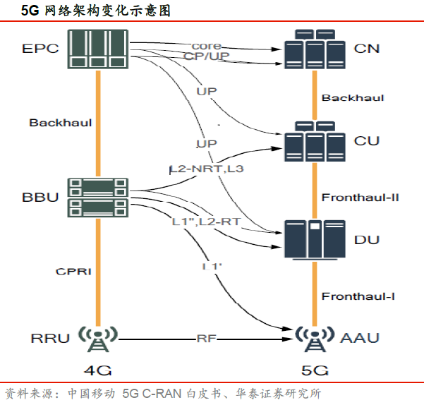 华泰证券指出,传输网是通信网络的重要组成部分,是用作传送通道的网络,一般架构在交换网、数据网和支撑网之下,用来提供信号传送和转换。5G时代,传统的基站BBU将重构为CU、DU两个逻辑网元,根据具体场景的要求不同,两者可以合并部署也可以分开部署。除了前传和回传需求光模块之外,在中传的环节也需要光模块,对于后面一种情况将多出增加CU和DU连接的中传环节,带来光传输和光光模块的新增需求。