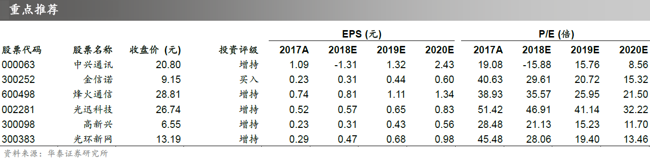 华泰证券重点推荐中兴通讯(000063.SZ)、金信诺(300252.SZ)、烽火通信(600498.SH)、光迅科技(002281.SZ)、中际旭创(300308.SZ)。