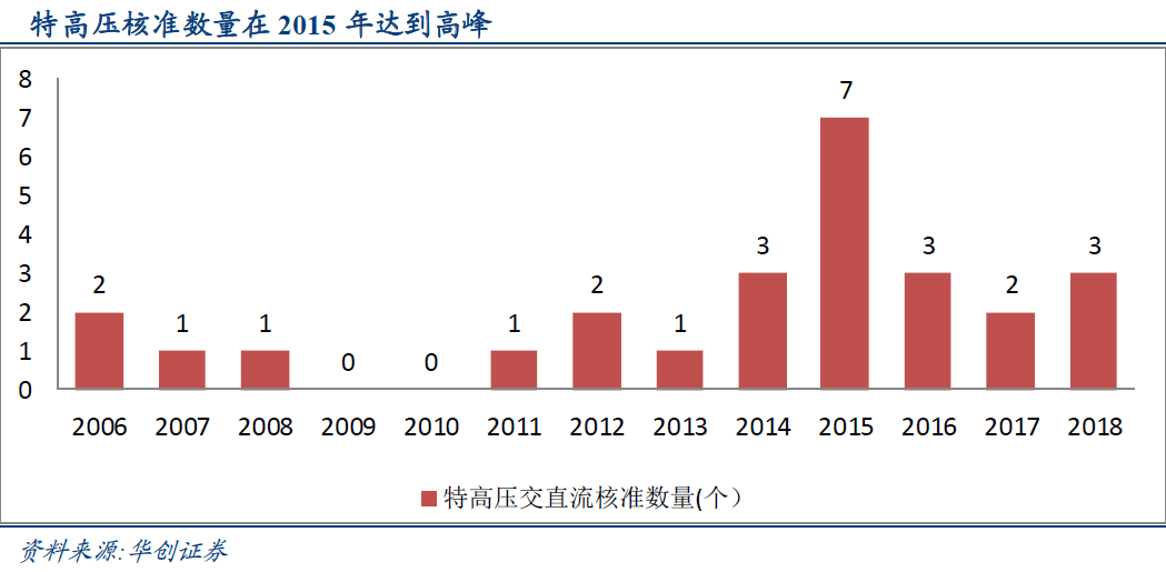 国内特高压经过启动、质疑、规模化发展、停滞、重启四个阶段。在基建投资加大、扶贫、新能源发展的背景下,2018年国家重启特高压项目核准、建设,特高压投资具有较强确定性。根据华创证券测算,本轮重启“五交五直”特高压项目投资规模2000亿元左右。