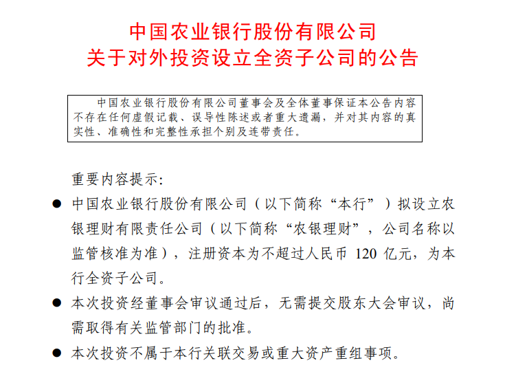 农业银行26日晚间公告称,拟设立农银理财有限责任公司,注册资本不超过120亿元。