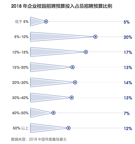 《2018中国年度最佳雇主评选报告》对近4万家企业的调查显示,87% 的企业2018年开展过宣讲会、招聘会等不同形式的进校园活动。平均而言,企业每年投入到校园招聘的预算占总招聘预算的比例在23%左右,其中,12%的企业半数预算投入到了校园招聘中。