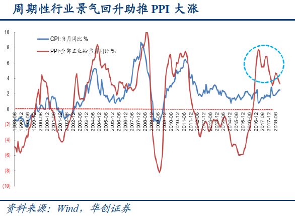 随着“三去一降一补”的经济结构性改革逐步深化,主要周期行业的供需格局得到改善。由于生产资料价格的上涨,全国工业生产者出厂价格指数PPI自2015年末的底部急剧攀升,2016年9月转正,为0.1%,2017年2月达到近年来的高点7.8%,此后震荡回落,2018年10月,PPI为3.3%。