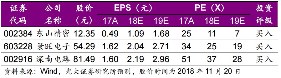 PCB行业市场空间大,在5G等细分领域增长迅速,陆资PCB企业利用内生发展和外延并购两种方式,有望实现快速发展,光大证券首次覆盖PCB行业给予“买入”评级。推荐关注东山精密(002384.SZ)、景旺电子(603228.SH)、深南电路(002916.SZ)。