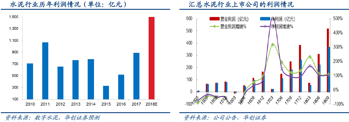 进入2018年,水泥产品价格的上涨表现出更强的持续性。华创证券模拟水泥行业吨毛利水平在2018年实现持续的上涨。反映到水泥行业上,2018年1-8月,水泥制造行业实现利润963亿元,增长1.5倍,全年行业利润将超过2011年1020亿元的历史高点;汇总相关上市公司,2018年1-9月上市公司营业利润与归属上市公司股东净利润增长均超过100%。