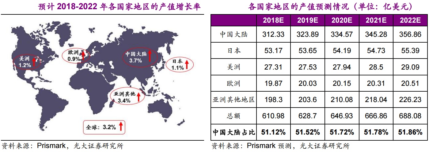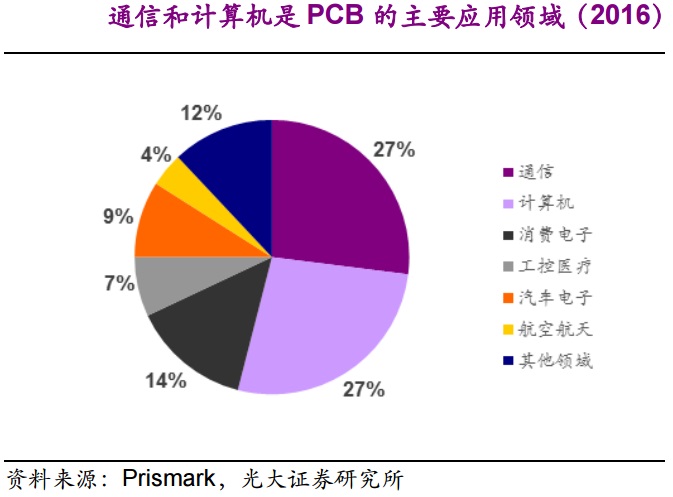 Prismark预测全球PCB产业在2017到2022年的年均复合增长率在3.2%左右,2022年将达到688亿美元。光大证券指出,通信是PCB最重要的下游应用领域,随着5G建设将从2019年开始拉开序幕,整体宏基站数量将大概是4G的1.5倍,并且将建设大量配套的微基站,总体PCB使用量将大幅增加。与此同时,高频高速传输的新需求将带来PCB层数、材料、工艺的大幅提升,通信板的价值量也会有大幅增加。