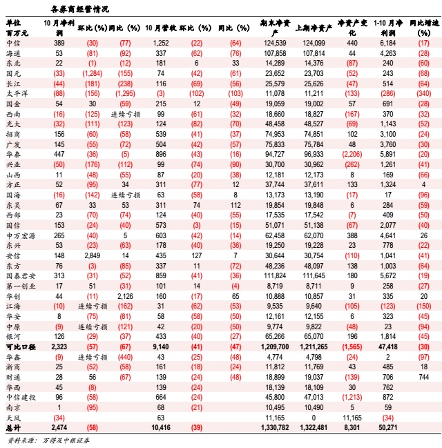 10月券商业绩环比下滑58%,同比下滑67%。已披露37家券商10月营收合计104.16亿,环比下滑39%,可比口径同比下滑47%;净利润24.74亿元,环比下滑58%,可比口径同比下滑67%;华泰、中信、国泰君安10月净利润位列前三,安信、第一创业、东吴10月净利润环比增速排名前三。