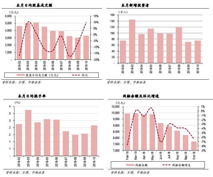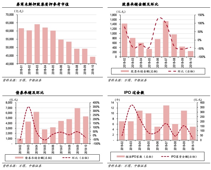中银国际认为,市场行情持续低迷拖累券商业绩大幅下滑,四季度业绩承压明显。10月市场普遍下跌,上证综指下跌8.29%,深证成指下跌10.93%,创业板指下跌9.62%,中小板指下跌13.06%;债市表现稳定,中证全债指上涨1.02%,自营业务受10月份行情下滑的拖累表现预计不佳。股基日均成交额环比上涨9.79%至3301亿元,经纪业务收入预计略有改善。两融余额较9月末下降6.38%至7702亿元,利息收入或受到影响;股票承销250亿元,环比下降43.64%,债券承销5343亿元,环比减少23.03%,投行业务承压严重,预计投行收入环比下滑显著。