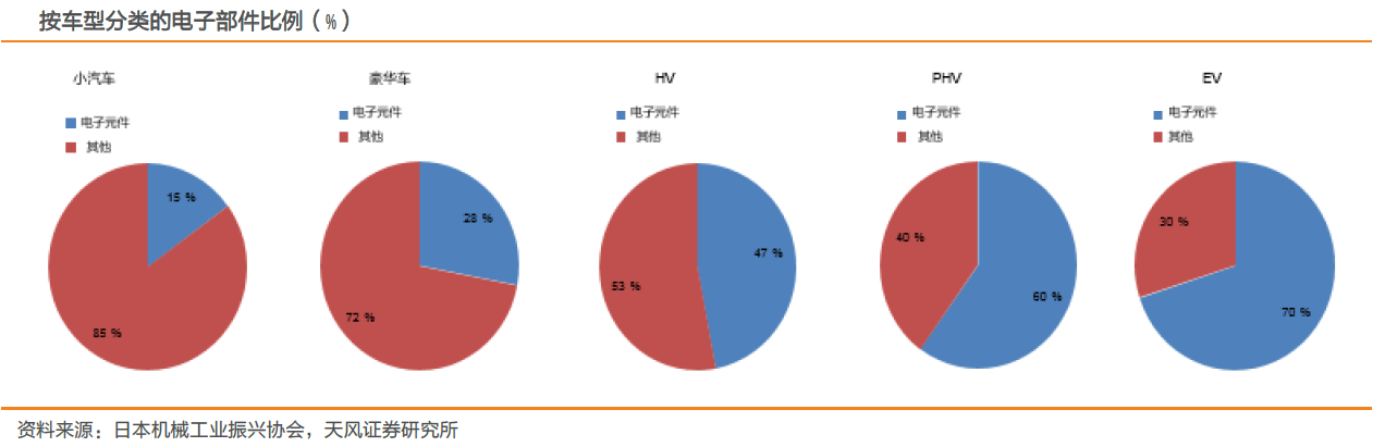 半导体(包括MCU、功率半导体和传感器)以功率半导体为例,电源驱动模块大量应用功率半导体,且应用于高压领域的IGBT用量显著提升,天风证券预计单车价值量由70美金上升至300美金以上及功率半导体正加速向国内转移,国内电子企业有望享受这一轮市场增长叠加市场转移带来的高业绩增长预期。