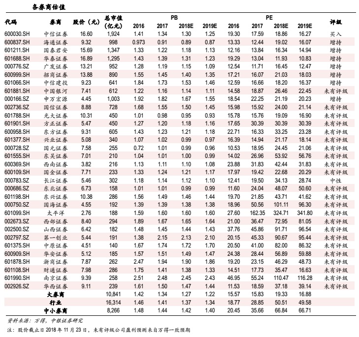 截至2018年三季度末,公募基金持有券商股市值186.47亿元,占总持仓比重1.99%,仍然大幅低配。随着监管层集中出台了一系列针对股质风险的举措,股质风险有所缓解,券商板块估值有所回升,截至2018年10月末,证券行业平均PB 1.26倍,大券商平均PB 1.19倍,仍然处于历史底部。