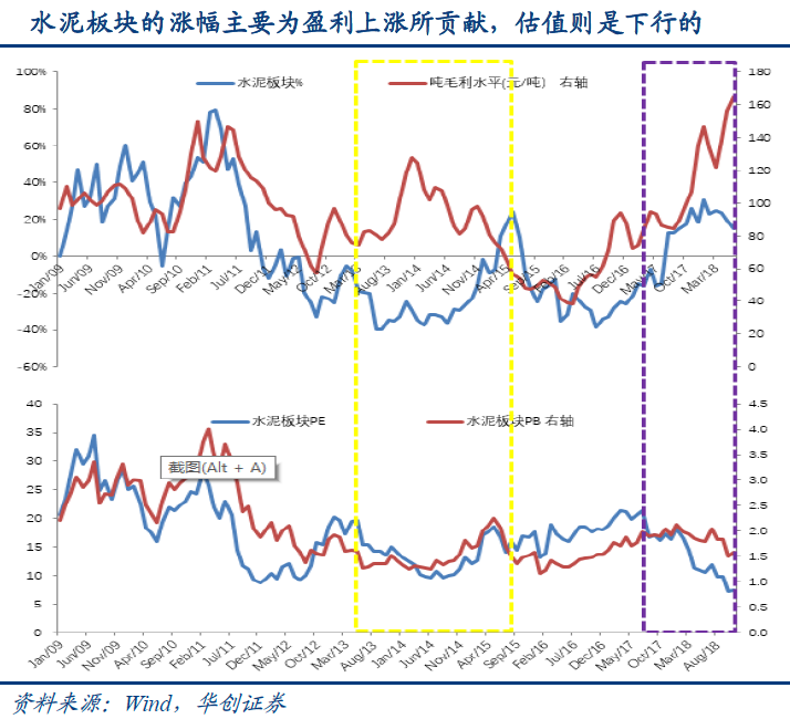 华创证券认为水泥板块表现较强的原因在于行业的盈利持续大幅增长,作为另一维度的估值,在2018年以来也是下降的。高盈利的原因在于贡献行业主要利润的南部地区需求尚可,且错峰生产、环保限产、行业自律之下,供给的收缩较为有效,库存长期保持低位,从而支撑了水泥价格高位运行。