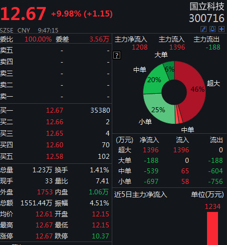 周三早盘,国立科技(300716)涨停,报12.67元,总市值20.27亿元。