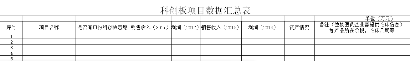 苏州工业园区金融管理局下发的“科创板项目数据汇总表”上,则罗列了:是否有申报科创板意愿,2017、2018两年的销售收入、利润,资产情况几项指标,如果是生物医药企业,则需要再提供如产品所在阶段,临床几期等信息。