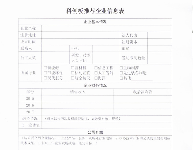 第一财经记者获取的这张“科创板推荐企业信息表”上,除了一些企业的基本信息外,主要涉及的指标包括:研发技术人员占比、发明专利数量、所属行业、销售收入、税后净利润、融资情况、上一轮估值等。同时要求企业简要介绍行业地位、核心技术、未来三年的发展战略。