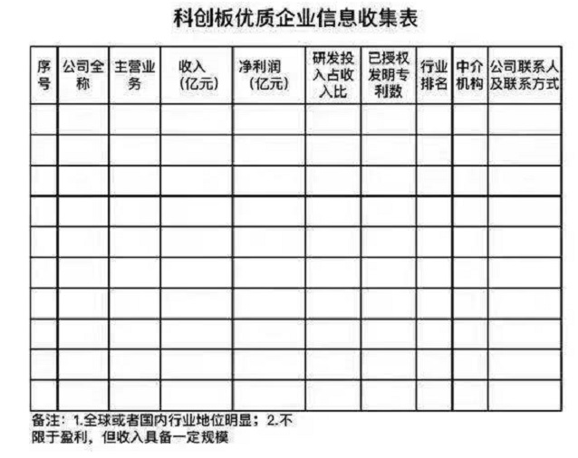 上海市经济和信息化委员会下发的《科创板优质企业信息收集表》显示,企业需要提交的指标包括:主营业务、收入、净利润、研发投入占收入比、已授权发明专利数、行业排名等。