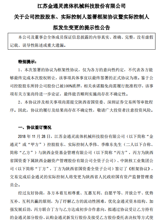 金通灵11月29日早间公告称,公司及控股股东、实际控制人季伟、季维东先生与陕西金资基金管理有限公司(为陕西省国资委下属陕西金融资产管理股份有限公司全资子公司)、中陕核工业集团公司(陕西省国资委全资子公司)签订了《框架协议》,交易完成后金通灵的实际控制人将变更为陕西省人民政府国有资产监督管理委员会。