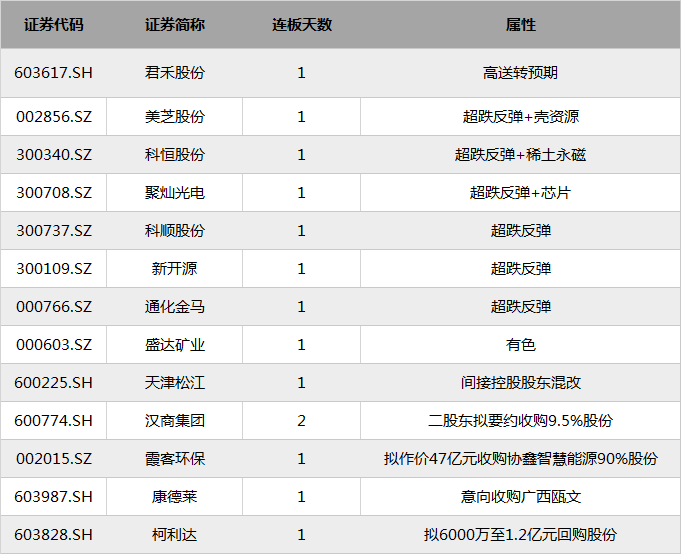 个股方面,两市仅300余只个股上涨,其中24只非ST个股涨停,超3000只个股下跌,28只股票炸板,炸板率56%。具体来看,超华科技(002288.SZ)(新经济概念)、凯美特气(002549.SZ)(疑似庄股)四连板,成为市场仅存的两只高位连板股。目前,市场暂无三板股,湖南发展(000722.SZ)(创投)、广电网络(600831.SH)(广电系)、天威视讯(002238.SZ)(广电系)、汉商集团(600774.SH)(要约收购)两连板,跟随在后。
