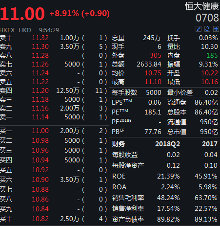 周五早盘,恒大健康大幅拉升,一度上涨超过8%。截至发稿,该股涨近9%,市值超过900亿港元。
