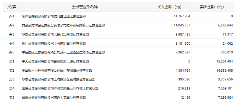 盘后数据显示,多家实力游资出货,中天证券台州市府大道、银河证券厦门美湖路分别卖出1530万元、1465万元。
