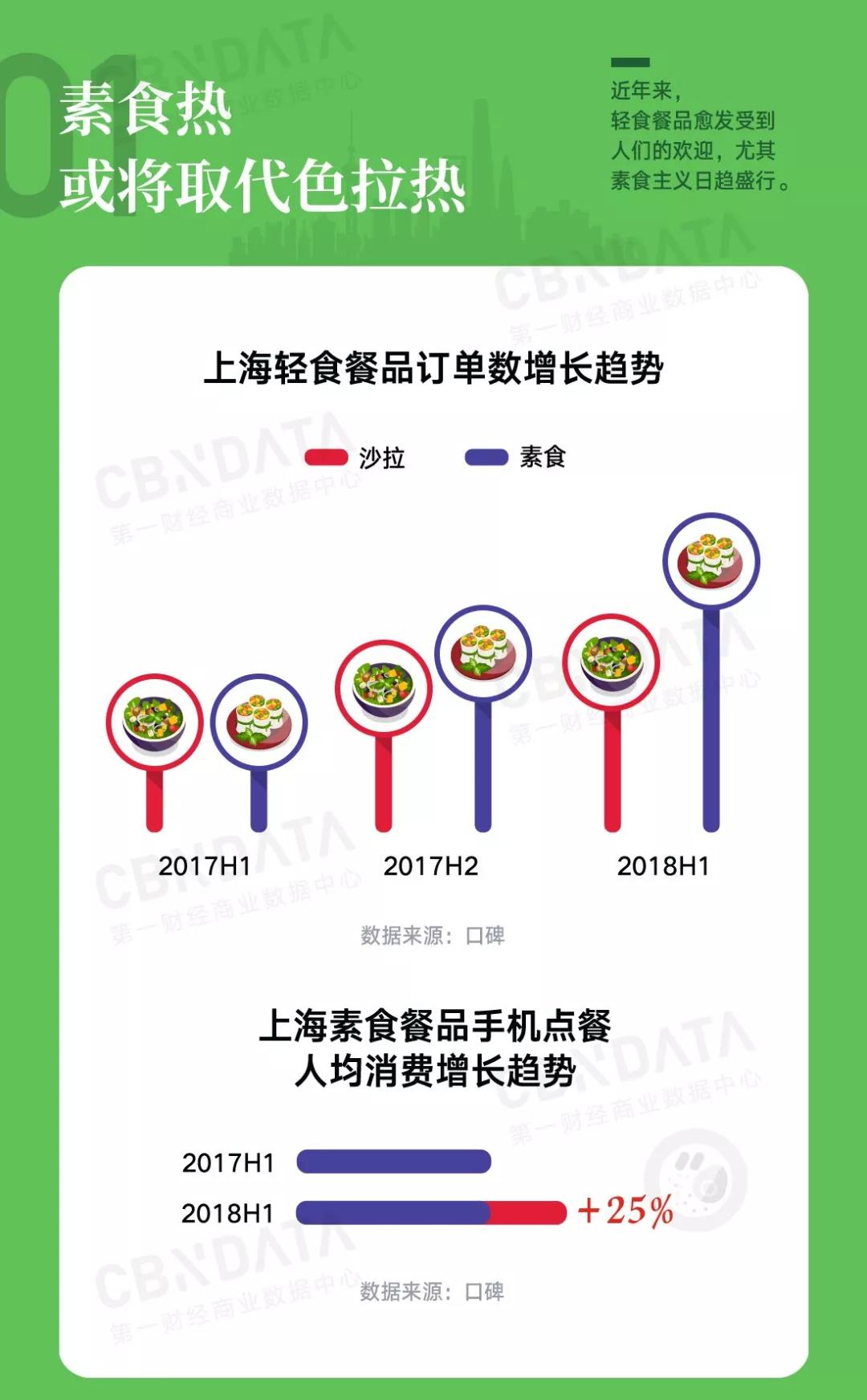 上海的食客们自然也是走在健康饮食潮流的尖端,2017年上半年到2018年上半年,沙拉和素食为代表的轻食餐品订单量持续增长,尤其是素食餐品,人均消费增长达到25%。可以说将绿色、健康、可持续贯彻得非常到位了。