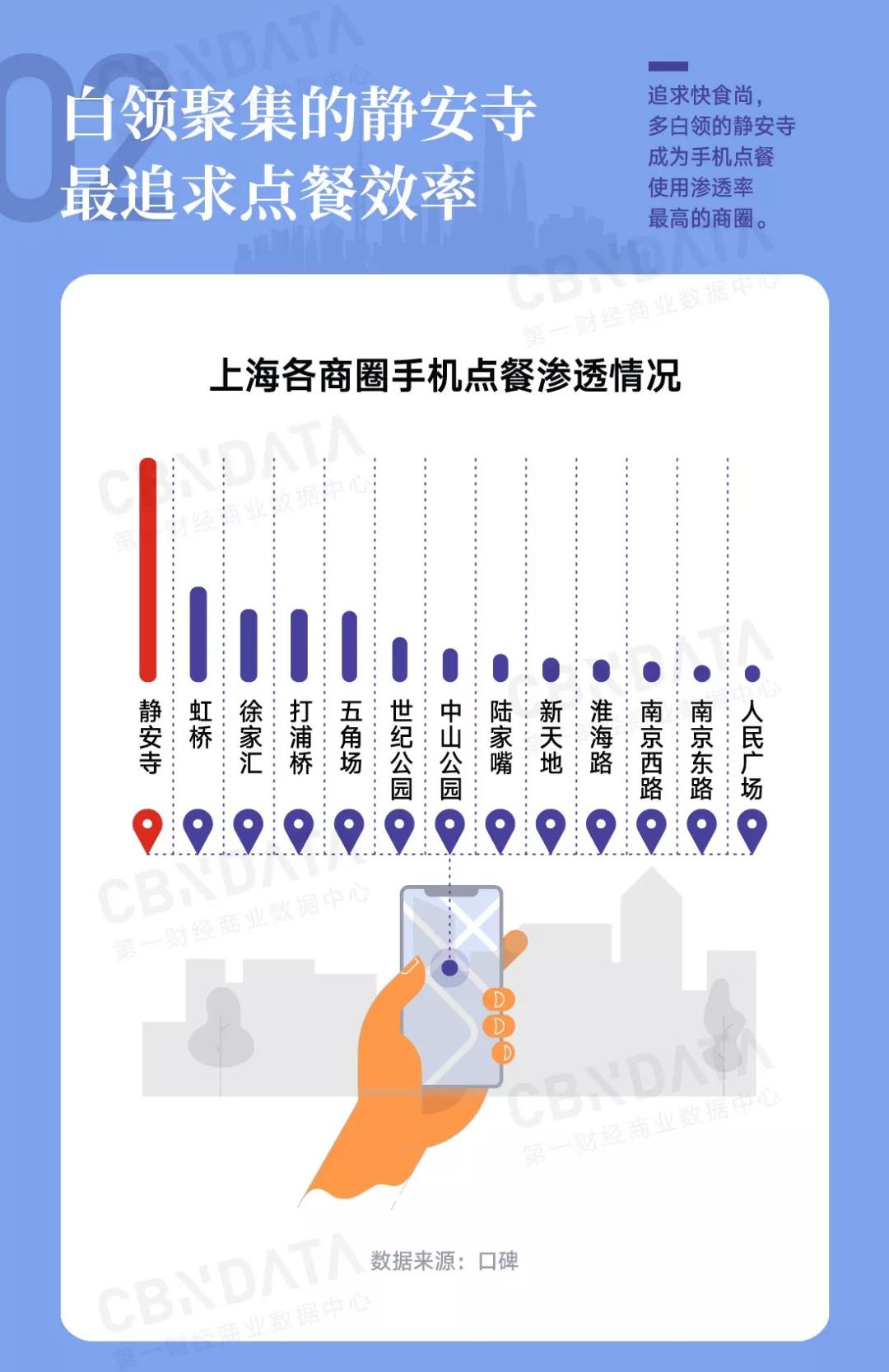 在静安寺、虹桥、徐家汇、陆家嘴等商业写字楼聚集商圈,对于韩晓晓这样的白领而言,手机点餐带来的高效已成为他们生活的一部分。其中,甲级写字楼众多的静安寺商圈白领对手机点餐的依赖度最高,这个商圈手机点餐的渗透率远远高于上海其它商圈。