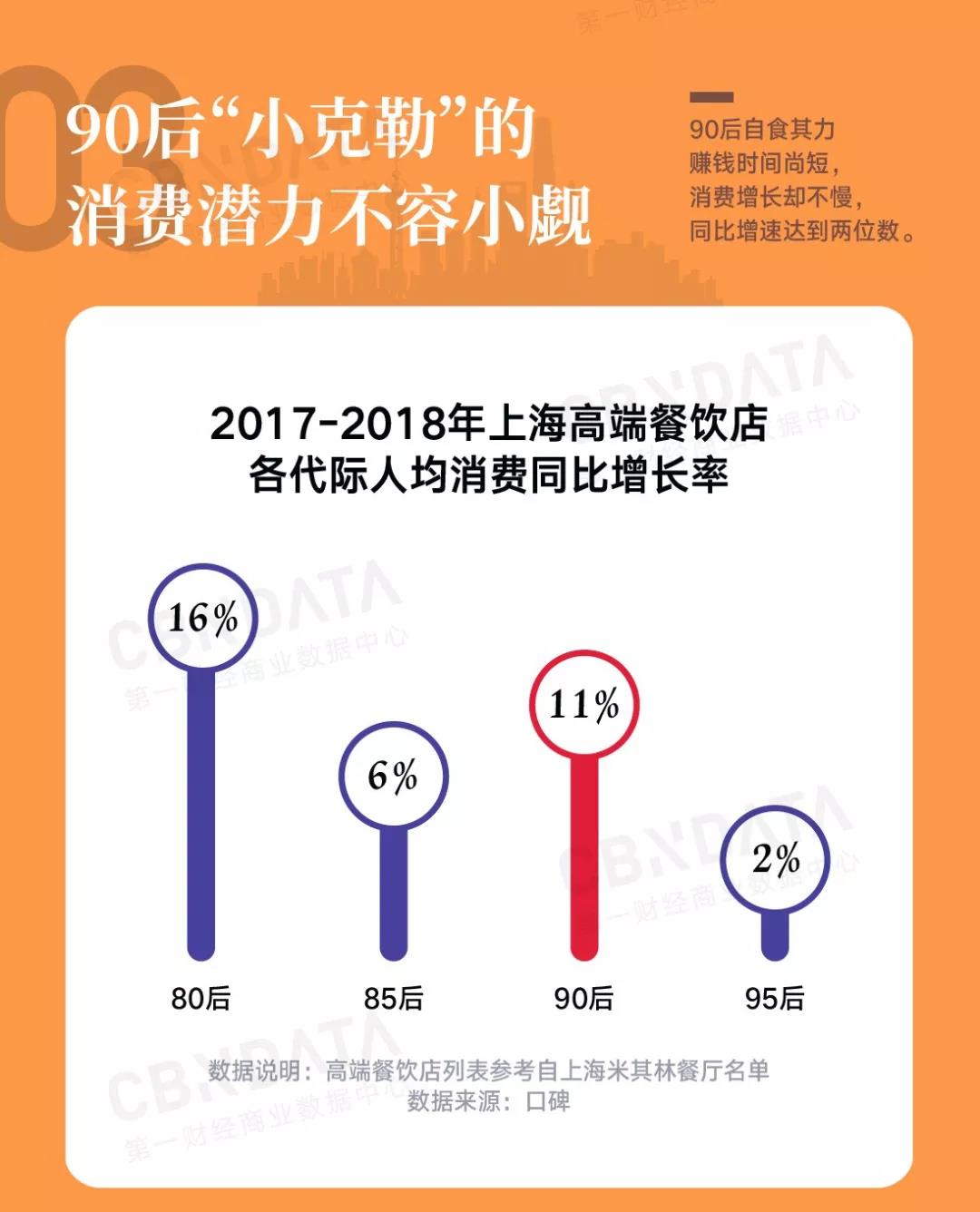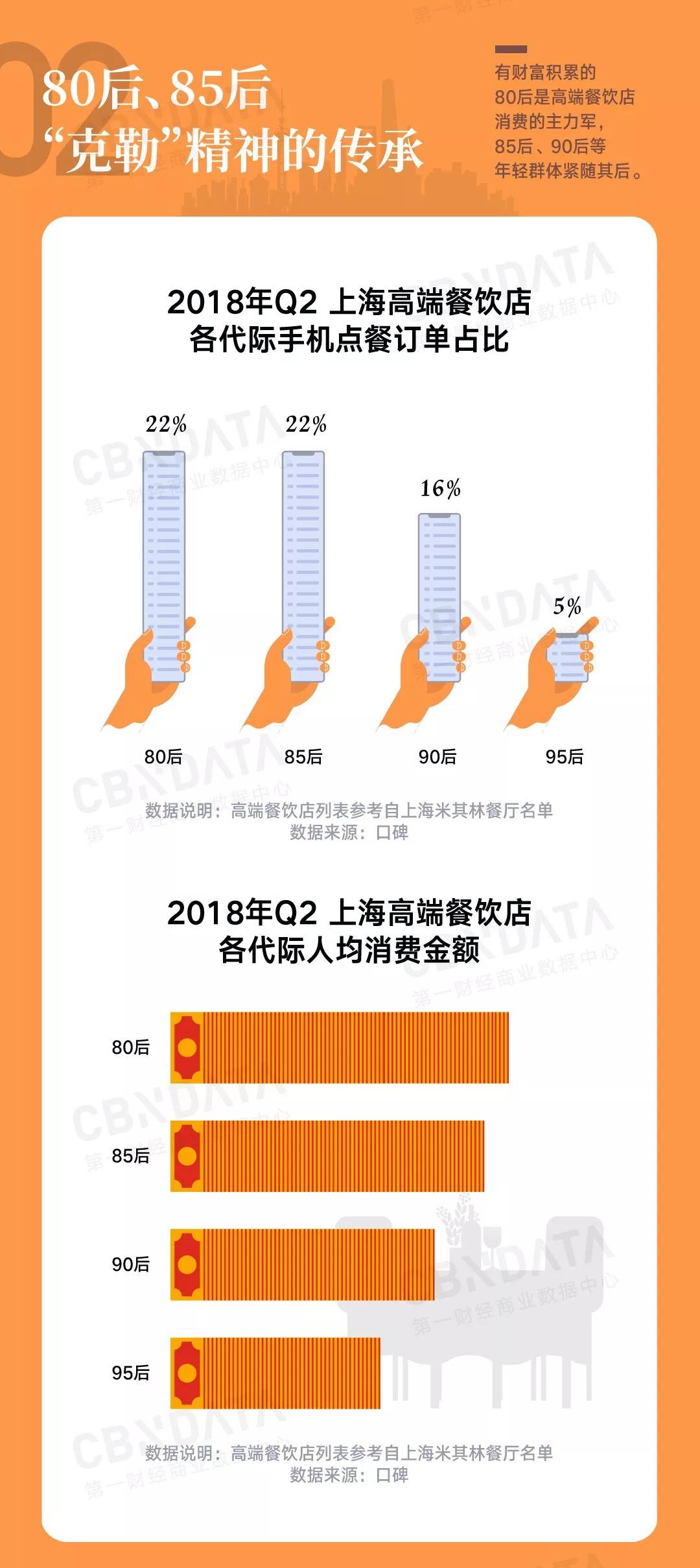 从人群来看,财力相对雄厚的80后、85后当仁不让,成为高端餐饮店消费的主力军,在2018年Q2上海高端餐饮店各代际的订单占比均为22%,90后紧随其后占比为16%。看来“小克勒”们已经将饮食的精致追求完美继承了。