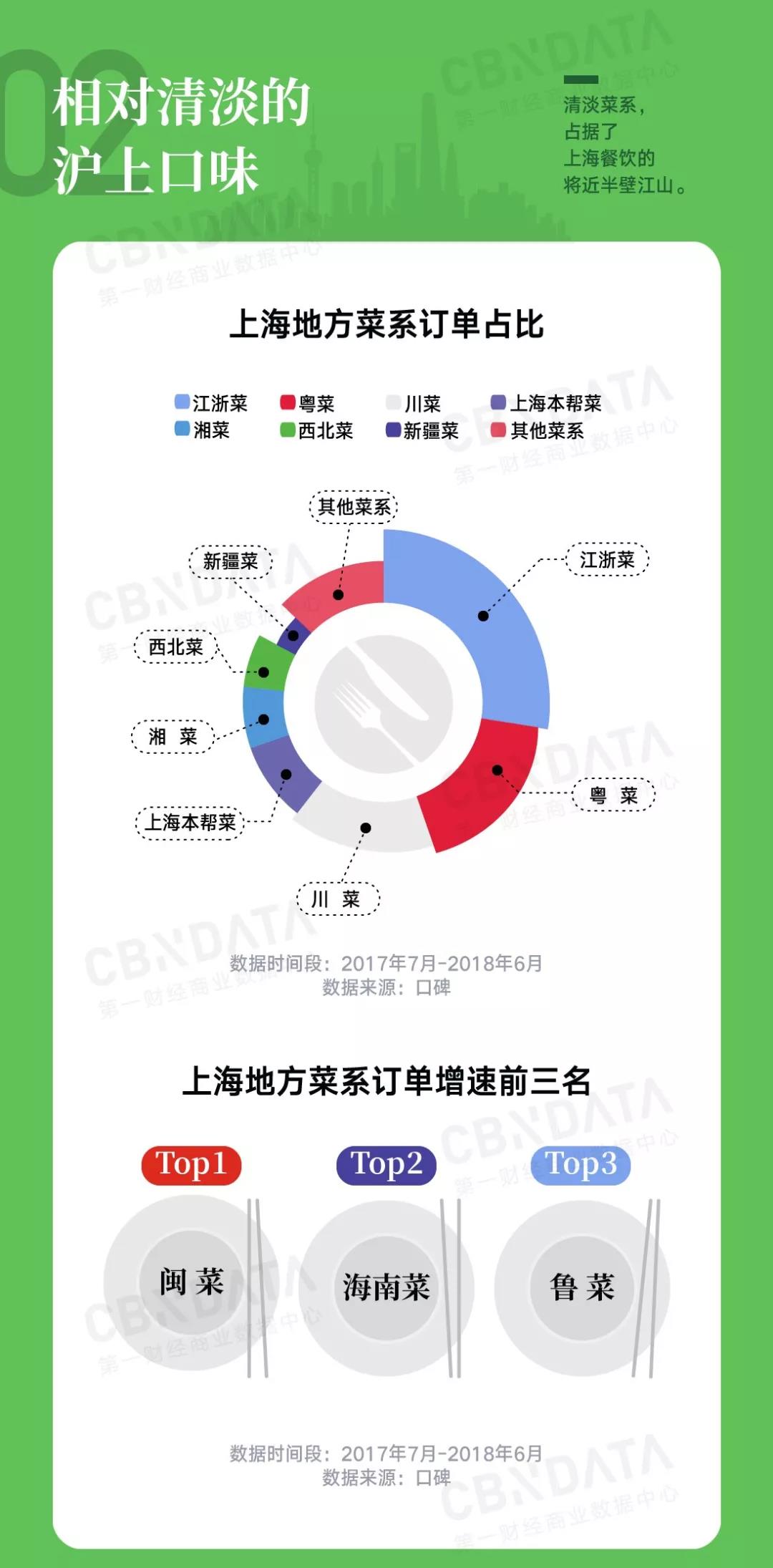 当然这也与上海人本身相对清淡的饮食偏好有关,虽然说上海本帮菜里有一些浓油赤酱的硬菜,但饮食习惯相对清淡。从整体菜系的热度来看,江浙菜、粤菜两大清淡菜系占据了上海餐饮的将近半壁江山,闽菜、海南菜也分列订单增速前两名。