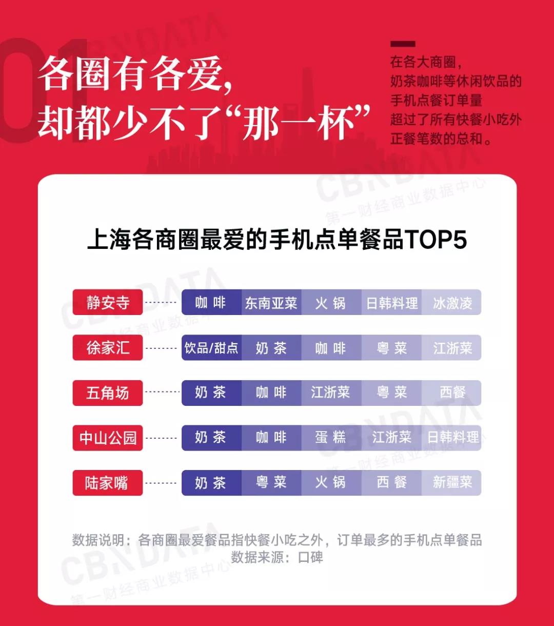 从口碑数据可以看出,除了小吃快餐外,在年轻人相对较多的徐家汇、五角场和中山公园等商圈,奶茶甜点这两大品类均位于手机点单的TOP1,而且奶茶咖啡等休闲饮品消费量超过了所有正餐笔数的总和,可以说多数年轻人宁愿吃的简单,也不能缺少那一杯奶茶~
