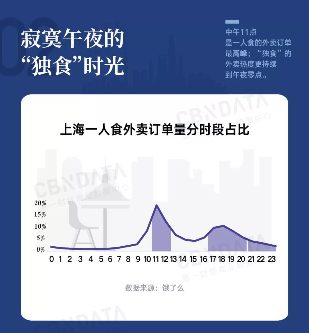 午餐与晚饭是一人食的订单最多的时段,其中中午11点是一人食的最高峰。此外工作一天回家休息后,再点一份夜宵刷一部网剧感受岁月静好,也成为日渐常态,因此一人食的外卖热度会持续到0点左右。