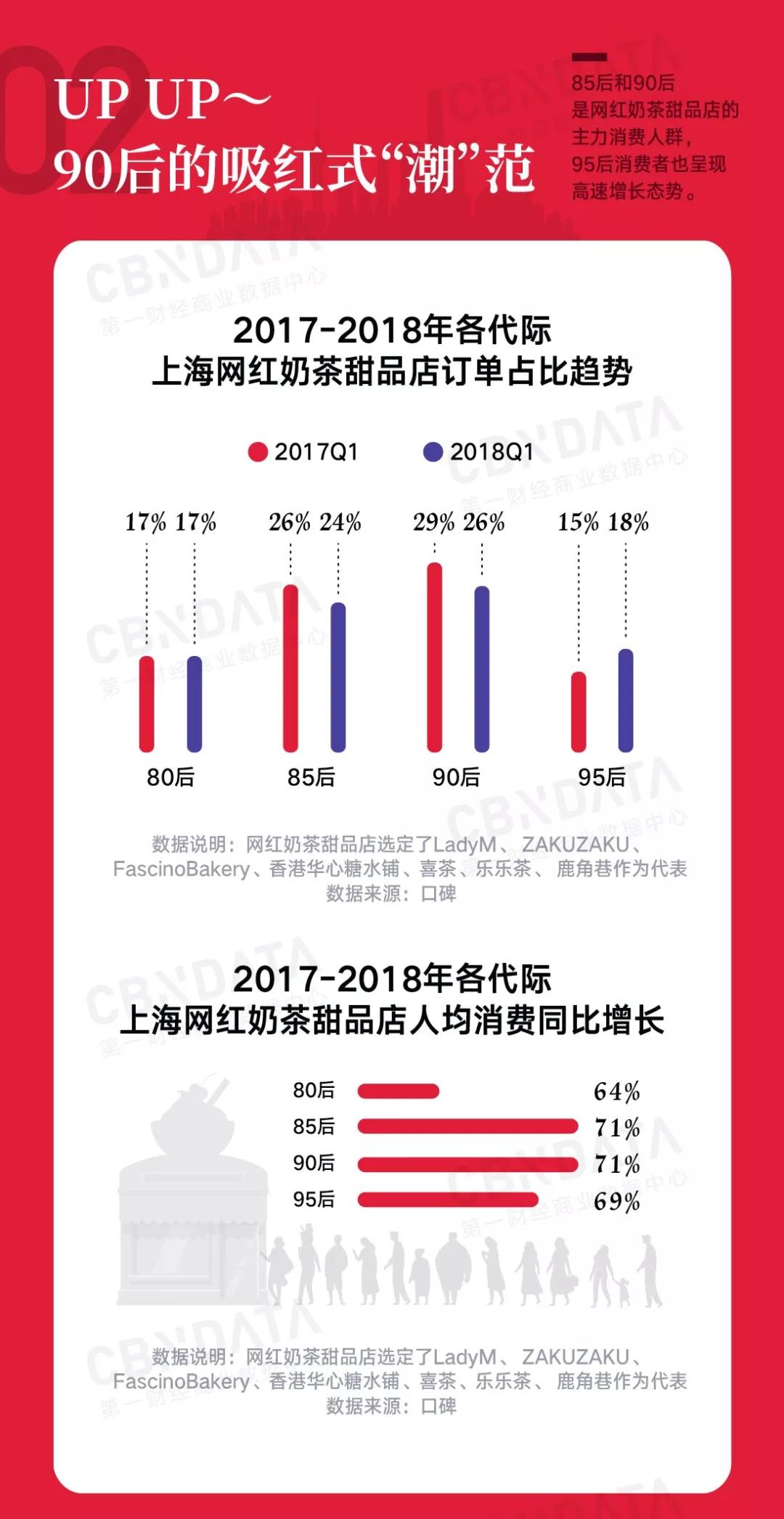 CBNData研究发现,85后和90后是上海网红甜品店的主力消费人群,但95后已经有日益赶超之势——相对其他年龄段,网红店订单占比较去年有明显提升。或许年轻人仰仗更快速的新陈代谢,吃吃喝喝也顾忌更少。