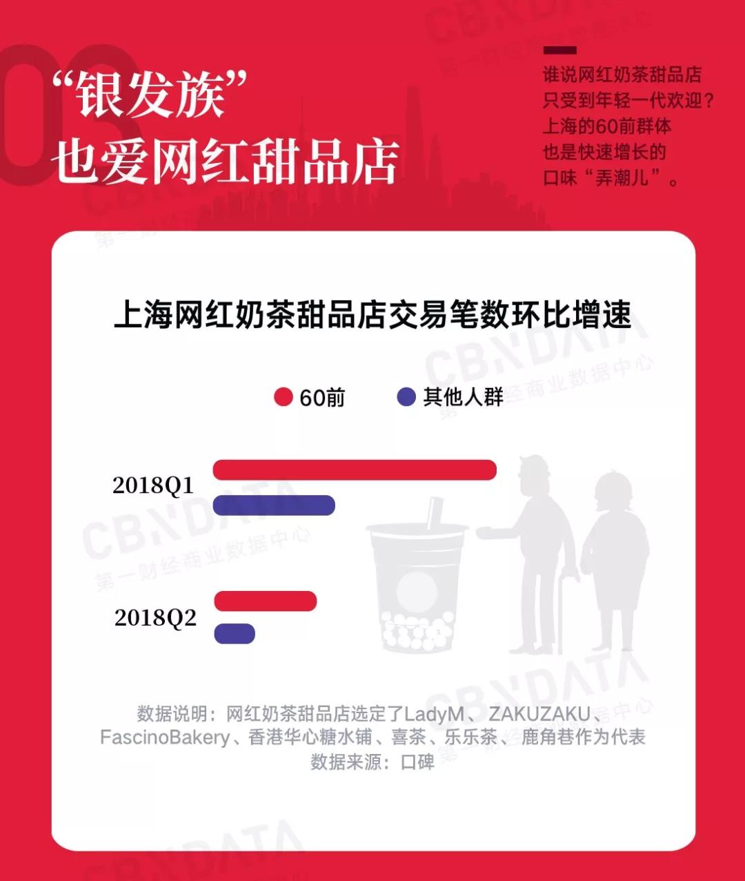值得注意的是,60前的消费者们也做了一次时代的“弄潮儿”,2018年他们购买网红甜品的数量增速要远超其他人群,可见上海的“爷叔”“阿姨”们,还保有追赶时髦的心。