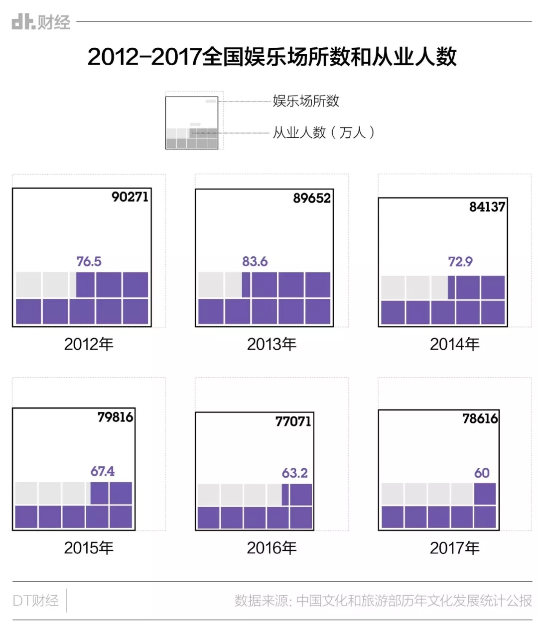 DT君(公众号ID:DTcaijing)查看了历年的文化发展统计公报,从2012-2017年数据来看,全国娱乐场所数量和从业者人数呈现出逐年下降的趋势,这里的娱乐场所,指以营利为目的向公众开放的歌舞、游艺等场所。也就是说,承载了我们娱乐和聚会记忆的歌厅、舞厅和游戏厅,早已不如当年如此备受欢迎。似乎这些年,人们被默默驱使,离线下娱乐场所越来越远。