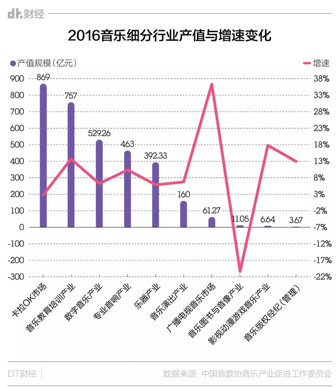 从关于音乐这件事儿的各个行业产值来看,尽管增速放缓,但卡拉OK依旧是最大的市场。
