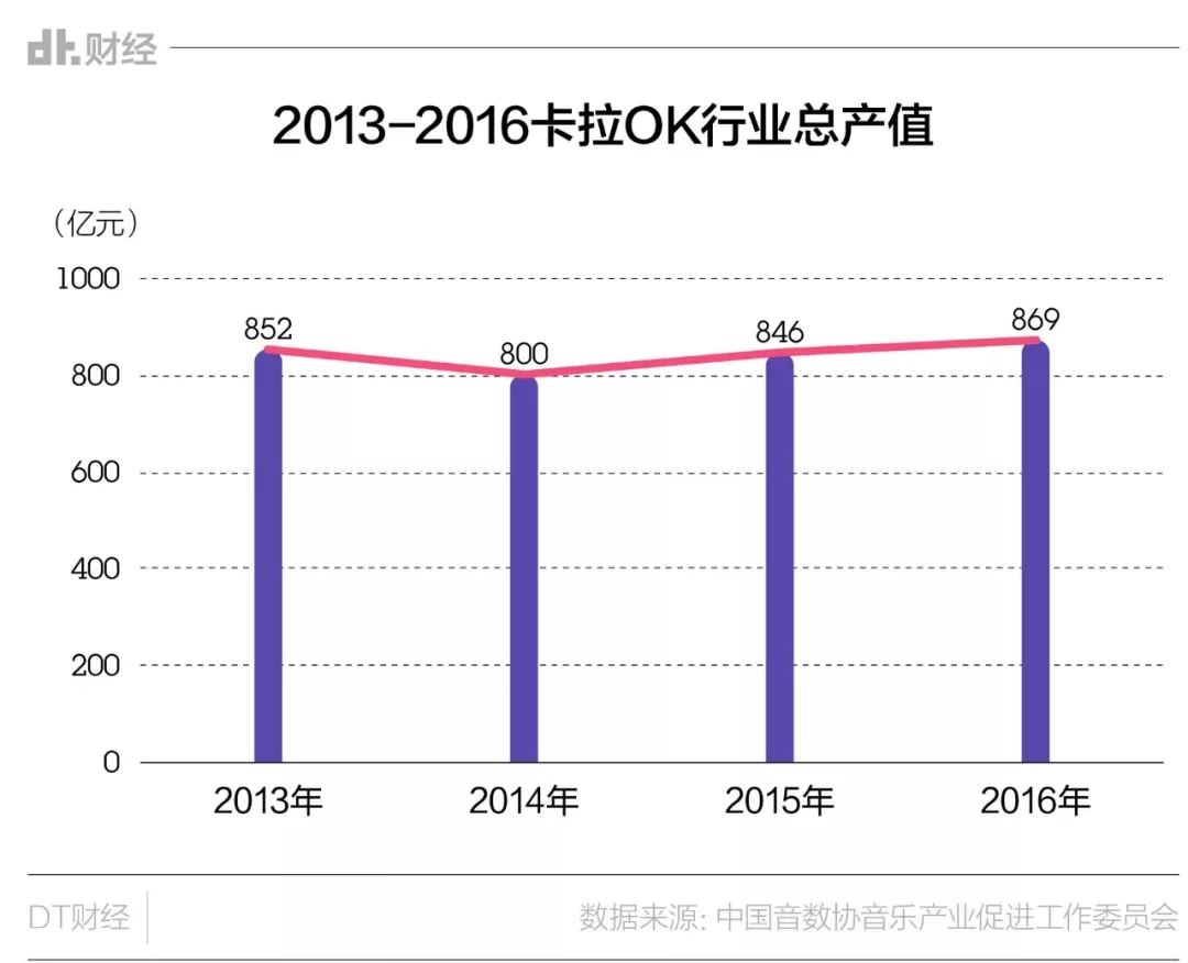 DT君(公众号ID:DTcaijing)在《2017中国音乐产业发展报告》中查看了近几年卡拉OK行业的总产值,发现尽管在2014年行业规模略有收缩,但之后出现反弹略有上升,2016年行业总产值达869亿元,同比增长2.7%。