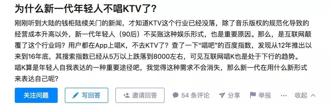 无独有偶,知乎上也有人提问,“为什么新一代年轻人不唱KTV了?”,吸引了500多个回答,被浏览了130万次。