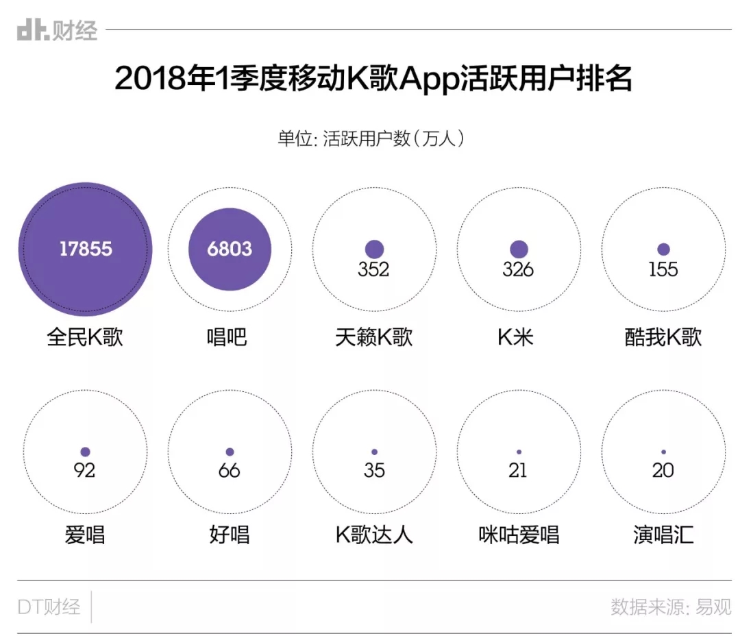 其中,全民K歌和唱吧二分天下,全民K歌一季度活跃用户数1.79亿人,唱吧以6803万活跃用户位于第二,线上K歌市场的流量几乎由两大App垄断。