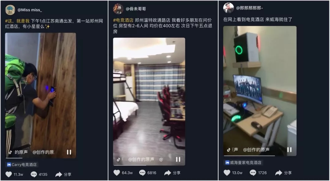 游戏玩家们,则成为备受讨好的新消费力量。那些充斥着喧闹声和烟味的“小黑屋”网吧,改头换面升级成为网咖和电竞馆。长期追踪各种网红物种的DT君(公众号ID:DTcaijing)还发现,电竞酒店在抖音上火了,热门短视频轻松获得几十万点赞。