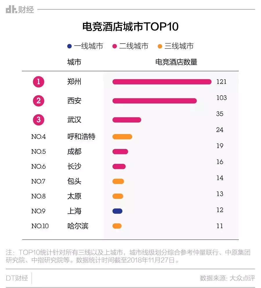 DT君(公众号ID:DTcaijing)采集了大众点评全国各城市的电竞酒店信息,从酒店数量来看,TOP 10城市中,放眼望去尽是二三线。上海作为唯一上榜的一线城市,拥有12家电竞酒店,但数量仅为郑州的十分之一。