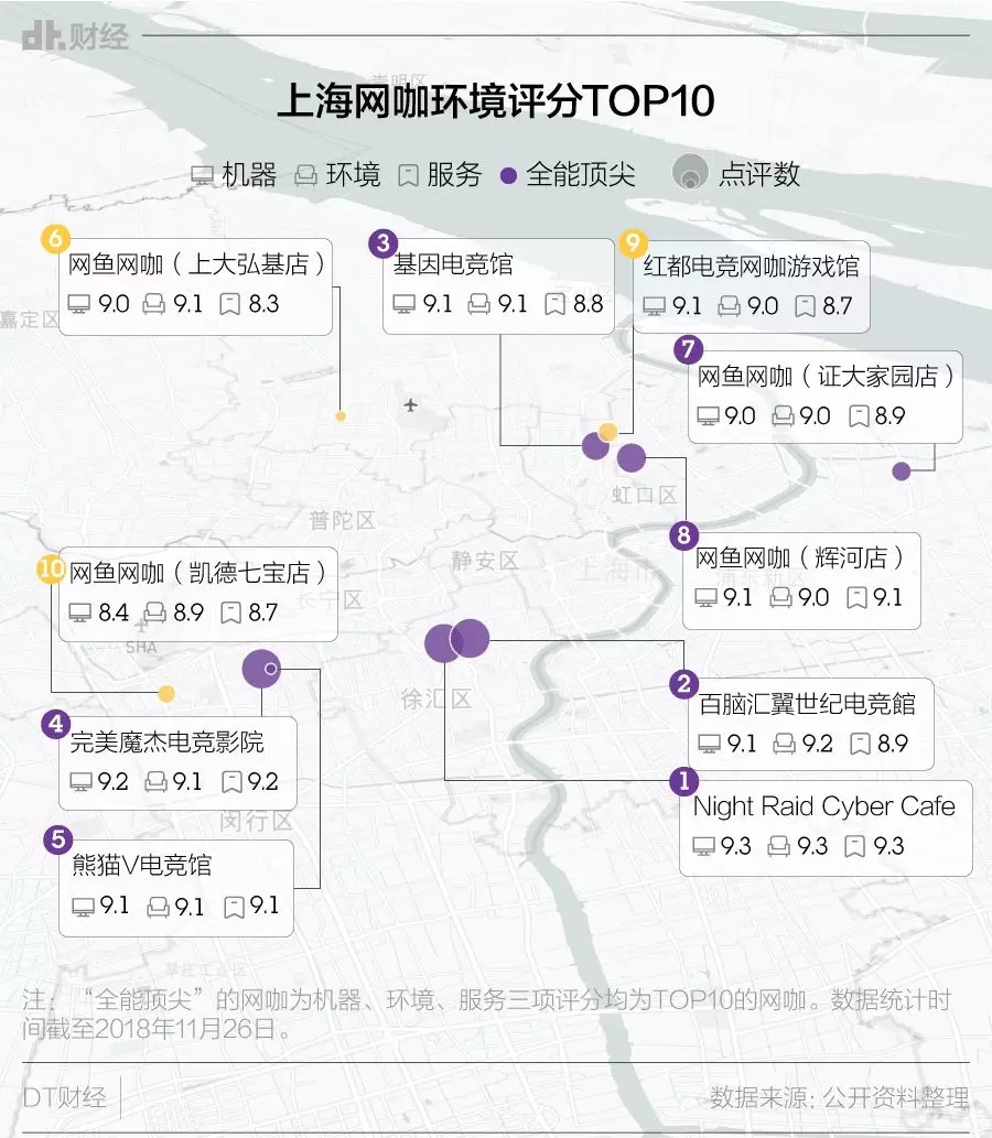 在魔都寸土寸金的市区,玩家们想要追求更舒适高端的游戏体验,还是去高端网咖和电竞馆最为便利。基于大众点评的环境评分,DT君得到了一份魔都网咖及电竞馆的最佳环境TOP10榜单,相信能为追求更好游戏体验的电竞玩家们指个路: