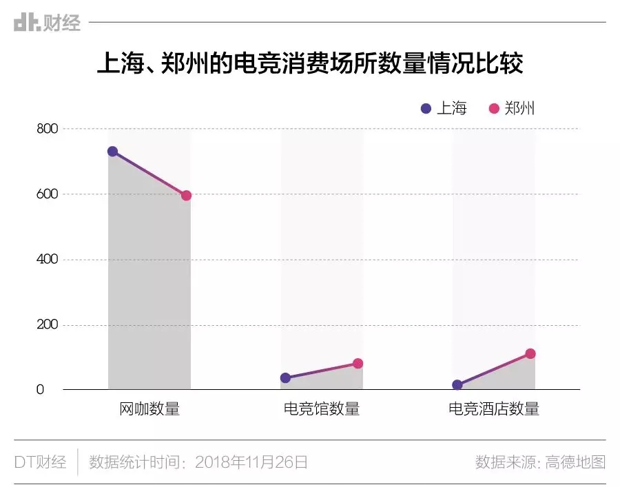 DT君(公众号ID:DTcaijing)统计了魔都的网咖、电竞馆和电竞酒店数量,与郑州相比,魔都在这两年兴起的电竞馆和电竞酒店规模上都不占优势,唯独网咖数量多于郑州。相对于魔都其他花样频出的休闲娱乐场所来说,电竞消费新物种的数量确实没有撑起大城市的体面。