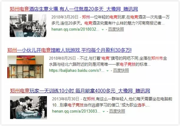 (图片说明:在搜索引擎搜索“郑州”和“电竞”,各种新闻报道都在向我们诉说郑州人民对电竞的热情。)