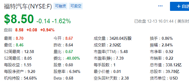 美国汽车股14日盘前普涨,福特汽车、通用汽车股价拉升,福特汽车一度涨超1.7%。截至发稿,福特汽车涨0.94%,通用汽车涨0.4%,特斯拉跌幅收窄。