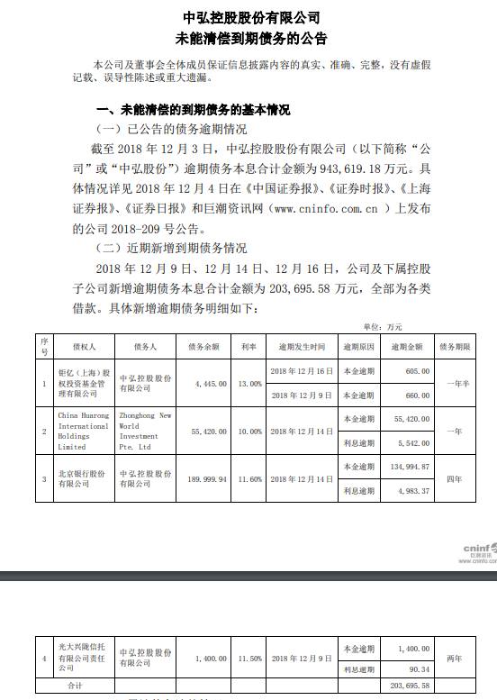 中弘退17日公告称,2018年12月9日、12月14日、12月16日,公司及下属控股子公司新增逾期债务本息合计金额为20.37亿元。