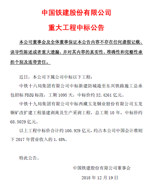 中国铁建18日晚发布公告称,近日,下属公司中标两个工程,合计中标约100.929亿元,约占2017年营业收入的1.48%。