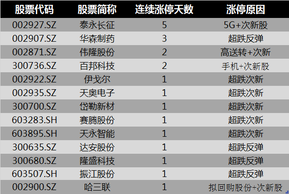 个股方面,两市非ST股30只涨停,7股跌停。泰永长征(002927.SZ)5连板打开市场高度引领次新股活跃,东方通信(600776.SH;900941.SH)、超讯通信(603322.SH)强势涨停引领5G概念活跃。接下来看详细涨停复盘: