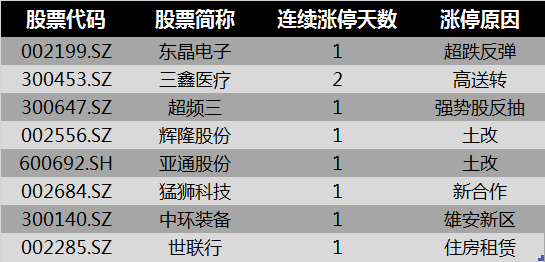从其它涨停个股来看,多为消息刺激涨停。像农业板块的辉隆股份(002556.SZ)、亚通股份(600692.SH),住房租赁板块的世联行(002285.SZ),高送转板块的三鑫医疗(300453.SZ)等。
