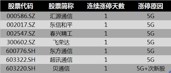 随着市场的回暖,5G股上演涨停潮。超讯通信、飞荣达(300602.SZ)、春兴精工(002547.SZ)、南京熊猫(600775.SH)、东方通信等多股涨停,其中东方通信股价创近期新高。
