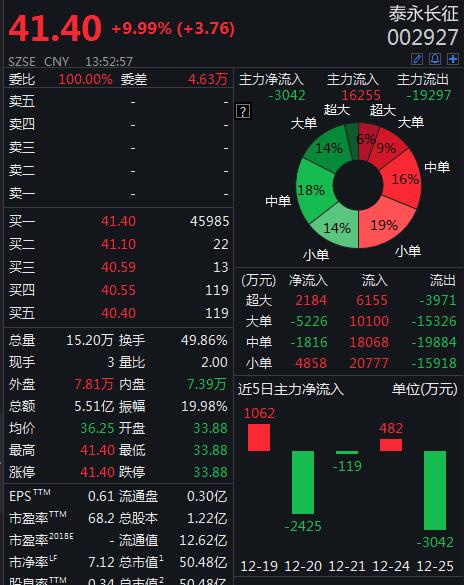 周二午后,泰永长征直线拉涨停,报41.40元,换手率接近50%,全天振幅近20%。此前该股集合竞价以跌停开盘。