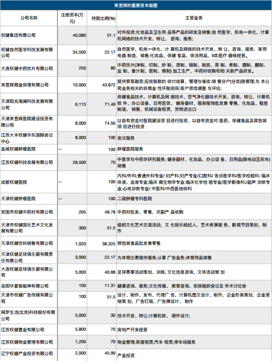 金融领域,束昱辉也早年就开始布局,2013年成立的束昱辉商业保理有限公司,其营业范围为提供贸易融资,应收账款的收付结算、管理与催收等业务。另一家天津束昱辉医院建设投资有限公司,从事的是对医院建设、医药、保健食品等项目进行投资;而注册资本2000万的辽宁权健产业投资有限公司。经营范围显示为产业投资。