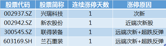 继汉嘉设计(300746.SZ)打出4板空间之后,泰永长征(002927.SZ)又走出近7板空间,为资金进军次新股增添了信心。今日近端次新股新农股份(002942.SZ)、兴瑞科技(002937.SZ)涨停,远端超跌次新股联得装备(300545.SZ)、兰石重装(603169.SH)涨停。