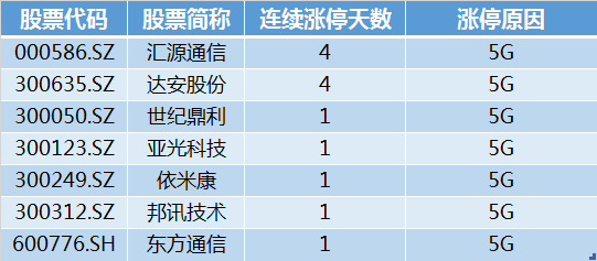 5G股近期频频大涨,邦讯技术(300312.SZ)早盘早早涨停引领节奏,东方通信是行业中军股,股价午后涨停不断刷新近期高点。达安股份(300635.SZ)、汇源通信连续4天涨停。世纪鼎利(300050.SZ)、亚光科技(300123.SZ)、依米康(300249.SZ)等个股跟风补涨。